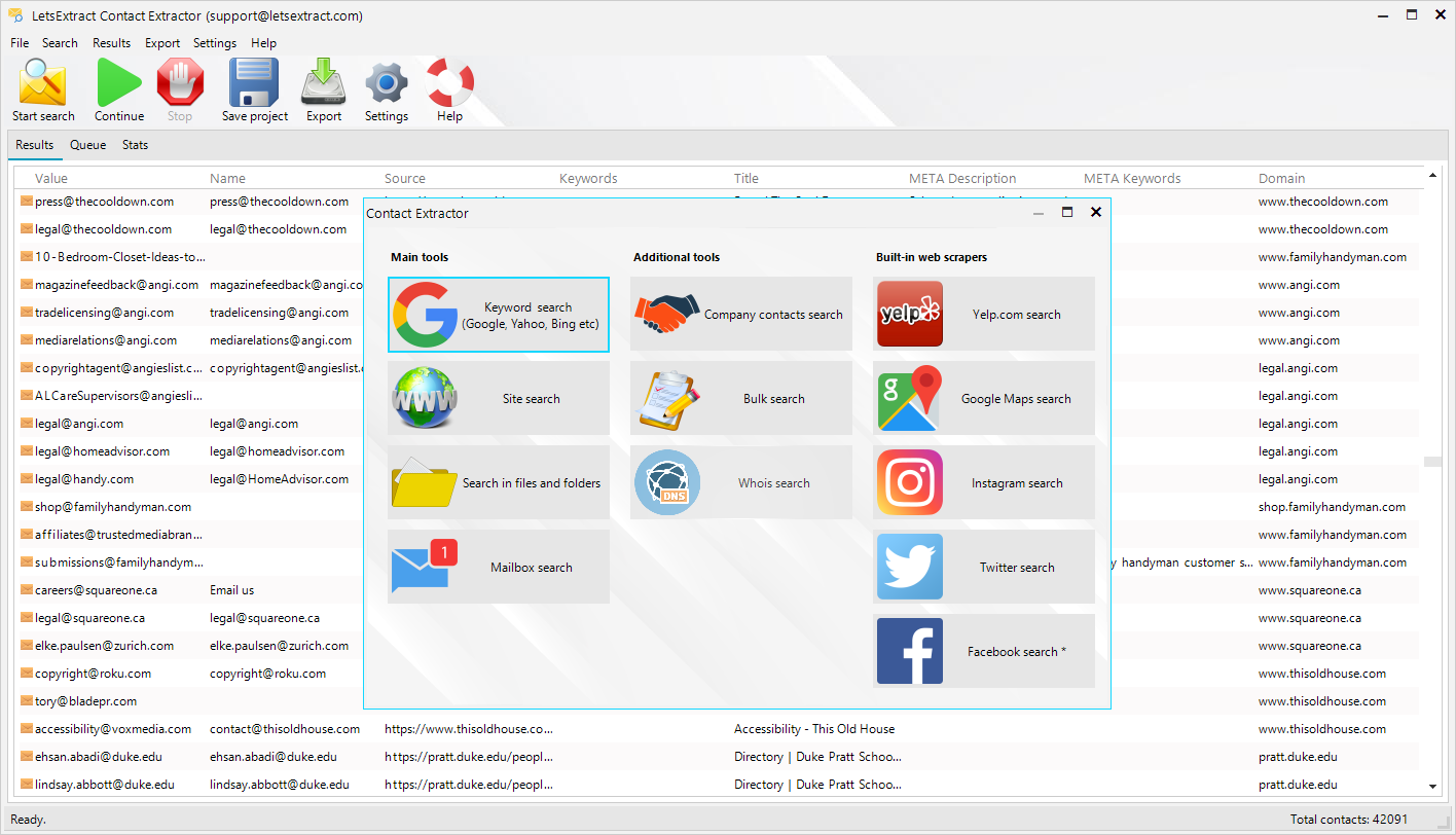 Collect email addresses from websites, search engines, social media platforms, Google Maps, and online directories based on keywords or target niches.